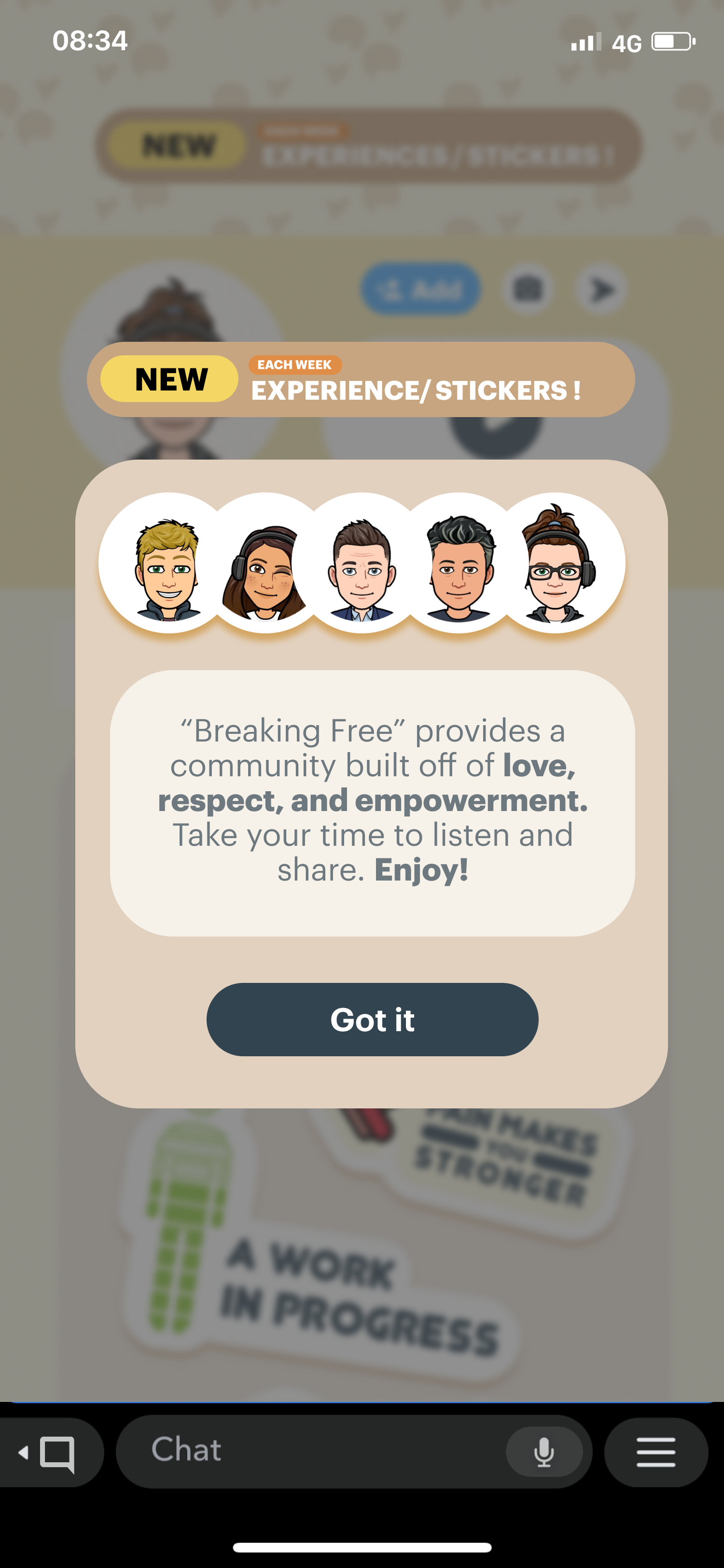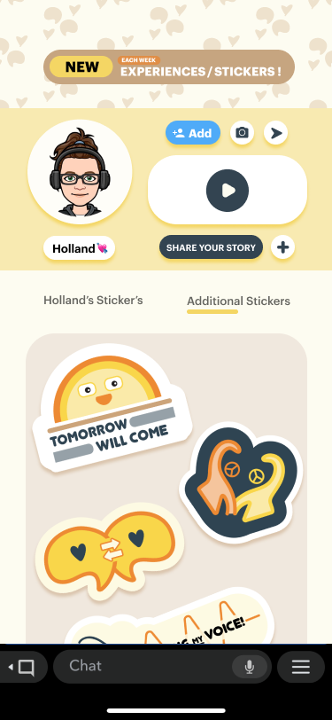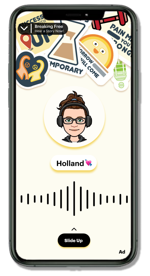 A designed Snap Mini, Breaking Free that aims to be a community for youth with incarcerated family members to use the healing power of storytelling and art. This Mini in partnership with the non-profit organization, Pops the Club, opens a space for these youth to connect with other youth speakers and share their stories through audio and expressive sticker design. The goal is to empower affected youth to share their story through Breaking Free which will ultimately influence others to follow.